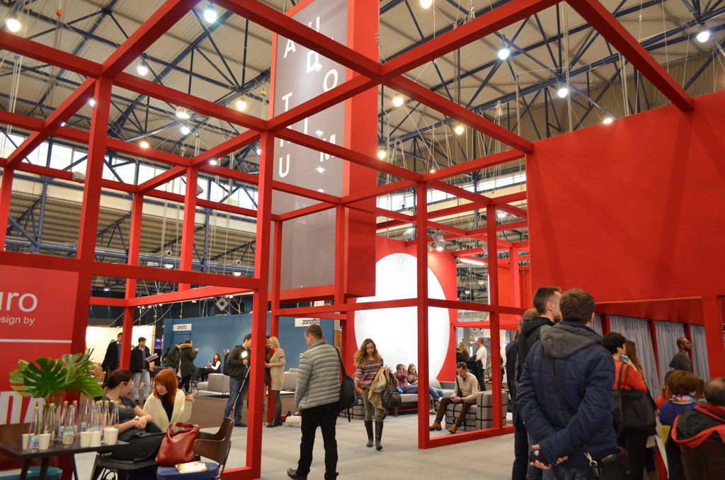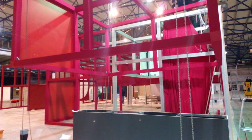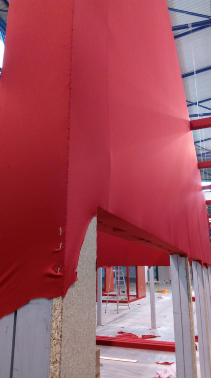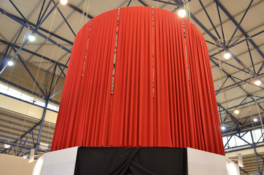 Драпировка высокой круглой конструкции красной Стрейч тканью для создания объёма.